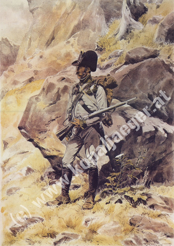 Adjustierung der österreichischen Jägertruppe ab 1809 nach OTTENFELD/TEUBER. Die Grundelemente der Jägeradjustierung bis 1861 sind bereits vorhanden: neben der Grauen Uniform sind die grünen Aufschläge sowie die Schützenschnur erkennbar. Der Jägerhut mit der charakteristischen hochgezogenen linken Krempe trägt allerdings noch nicht den später eingeführten Hahnenbusch sondern eine schwarz-goldene Kokarde an der Vorderseite. Ergänzt wurde dies anfangs mit einem kleinen grünen Federbusch nach der Art der Infanterie hinter der Kokarde, welcher später dem Hahnenbusch auf der linken Seite wich - Beim Klick auf das Bild öffnet sich ein neues Fenster mit einer grösseren Darstellung des Bildes!