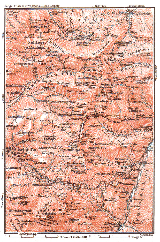 Kleinformatige Karte der Umgebung von MOENA und VIGO DI FASSA, Verlag WAGNER und DEBES, LEIPZIG 1910, Sammlung WGE - Beim Klick auf das Bild öffnet sich ein neues Fenster mit einer grösseren Darstellung des Bildes!