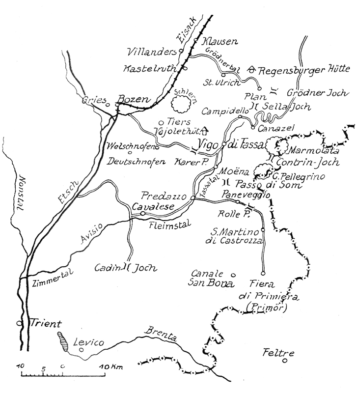 Das Fassatal stellte durch seine Lage zwischen MARMOLATA[3] und ROSENGARTEN die östliche Grenzsicherung Südtirols an der neuen Reichsgrenze zu Italien dar und sollte im Zuge des ersten Weltkrieges durch die Kämpfe am und im Gletscher des MARMOLATA noch traurige Berühmtheit erreichen. In den Jahren der Garnison im Fassatal wurde das Bataillon vor allem im Gebirgskampf geschult, ausgedehnte Bergtouren wurden in den umliegenden Tiroler Bergen aber auch in der Freizeit unternommen. So wird unter Anderem von einer Tour des Offizierskorps über die Westflanke der MARMOLATA unter der Führung des neuen Bataillonskommandanten Dr. v. ECCHER berichtet.