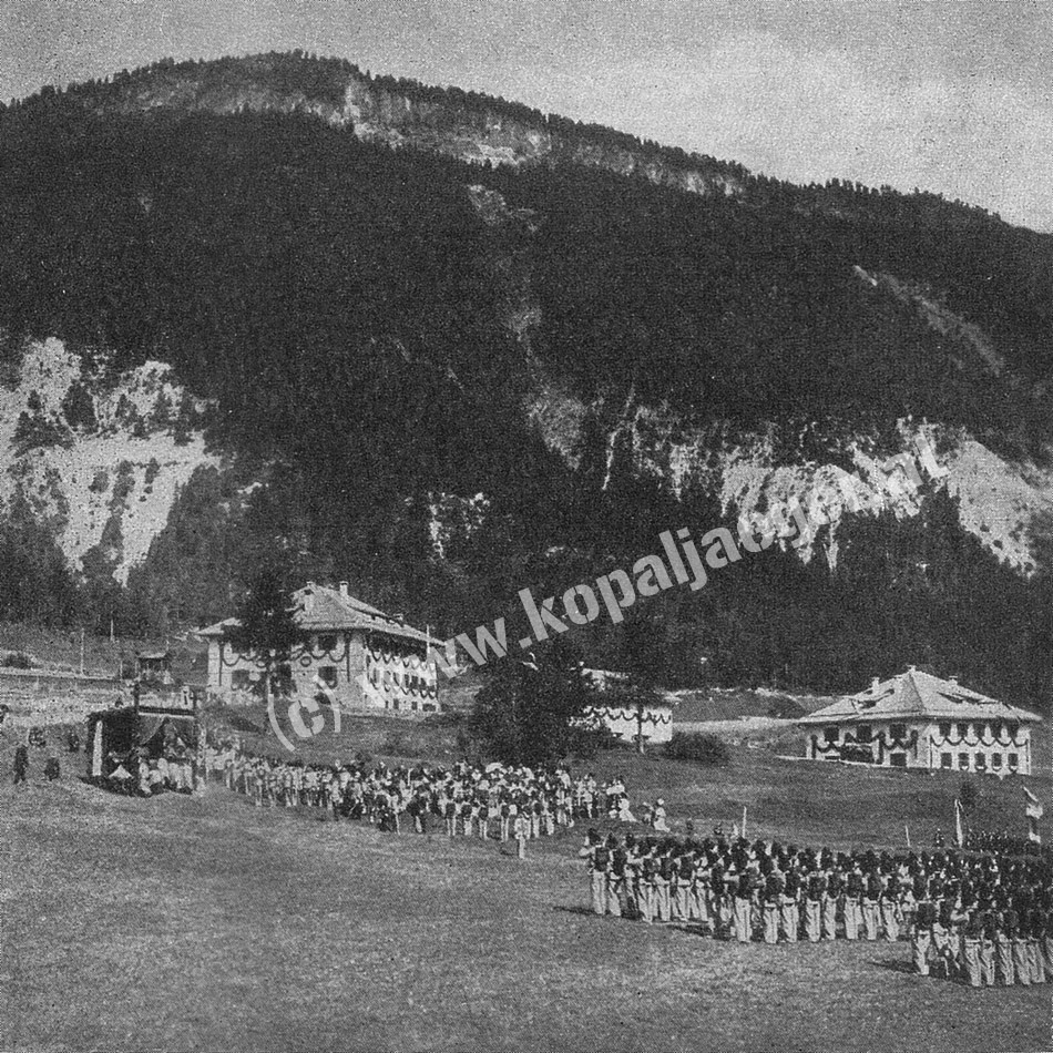 Feldmesse am 18. August 1918 in VIGO DI FASSA vor der neuen Kaserne der Kopaljäger, im Hintergrund die Berghänge des CIAMPEDIE, Ausläufer des ROSENGARTENS in: ROST Alfred, Geschichte des k.u.k. Feldjägerbataillons Kopal Nr. 10 1914-1918, WIEN 1938, Beilage 1, S 26 - Beim Klick auf das Bild öffnet sich ein neues Fenster mit einer grösseren Darstellung des Bildes!