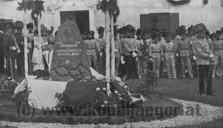 Nach der Feldmesse und der Defilierung des Bataillons vor den Ehrengästen sammelten sich die Gäste und das Bataillon vor dem Offiziersheim zur Enthüllung des Gedenksteines anlässlich der 100 Jahrfeier. Der "Kopalstein" war nach dem Entwurf von Hauptmann BÜTTNER aus grünem Marmor errichtet worden und trägt als Medaillon das Bildnis Karl v. KOPAL´s des Bildhauers Gustav GURSCHNER´s, welches auch auf dem » Grabstein aus 1911 angebracht ist.[5]