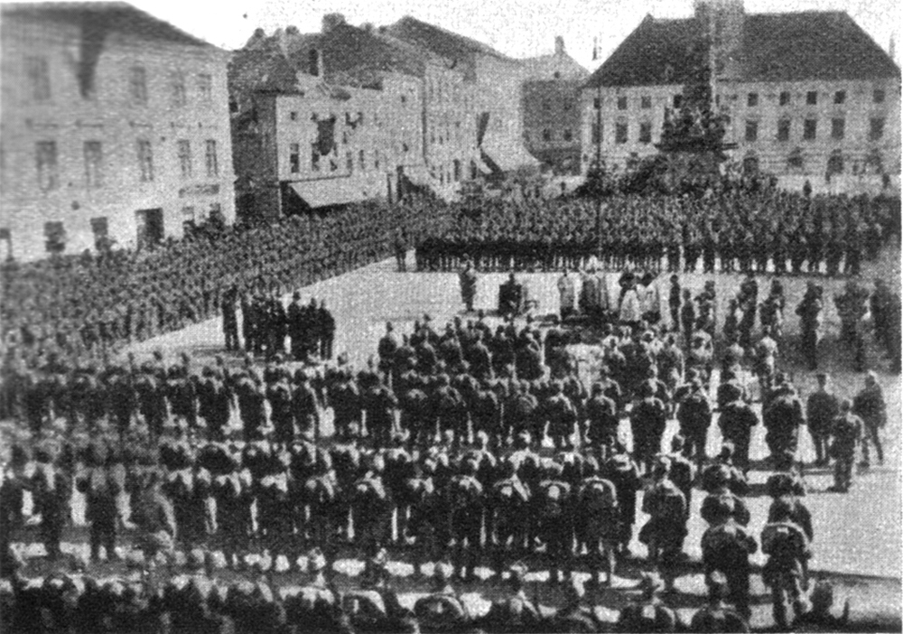 Eidesleistung der Kopaljäger am 10. August 1914 um 1600 Uhr am Rathausplatz in ST. PÖLTEN , in: ROST Alfred, Geschichte des k.u.k. Feldjägerbataillons Kopal Nr. 10 1914-1918, WIEN 1938, Abbildung 5, S 13 - Beim Klick auf das Bild öffnet sich ein neues Fenster mit einer grösseren Darstellung des Bildes!