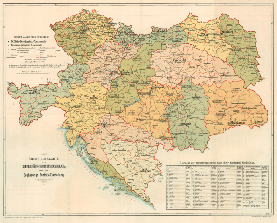 Übersichtskarte der Territorialkommanden 1894, Original Österreichisches Staatsarchiv- Beim Klick auf das Bild öffnet sich ein neues Fenster mit einer grösseren Darstellung des Bildes!
