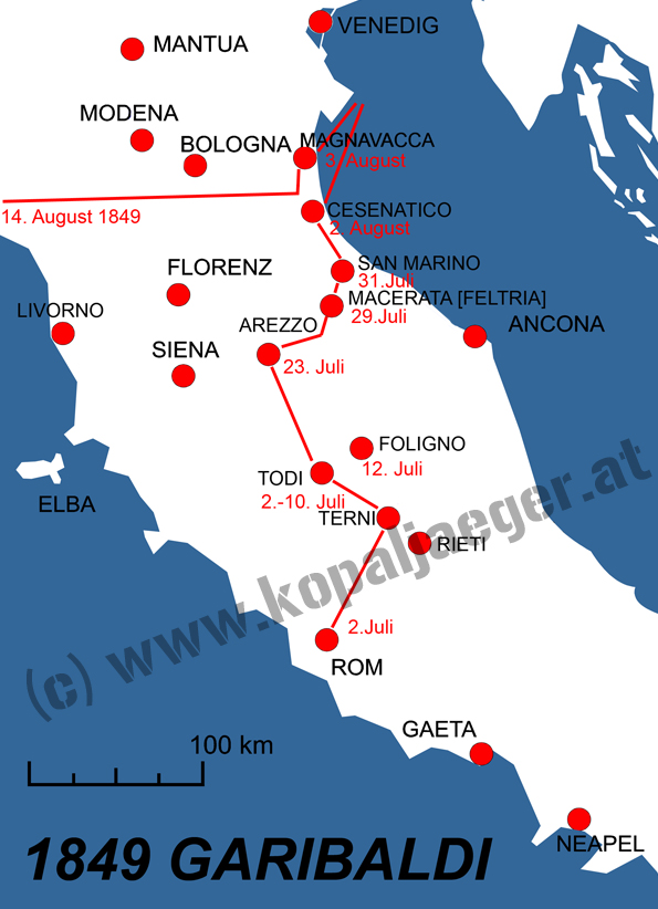 Die Jagd auf GARIBALDI Juli-August 1849Nach der Anerkenntnis der Niederlage der Römischen Republik am 1. Juli und der bevorstehenden Besetzung der Stadt ROM durch die Französische Expeditionsarmee unter General Nicolas OUDINOT wollte sich GARIBALDI nicht der Kapitulation der Republik ROM unterwerfen. Er durchbrach am 2. Juli mit seinen restlichen 4.000 Revolutionären nach dem Waffenstillstand den Belagerungsring der französischen Truppen und hielt sich eine Woche im Raum TERNI und TODI auf. Zuerst wollte er in NEAPEL den Aufstand neu entzünden und sich gegen die ABBRUZZEN wenden. Hier wurden die Städte und Pässe jedoch von österreichischen Truppen gesperrt und nach einem vergeblichen Ansatz auf FOLIGNO am 12. Juli zog GARIBALDI nun in die TOSKANA, deren Grenze er am 17. Juli überschritt. Da vermutet wurde, er könne versuchen an der Westküste zwei amerikanische Kauffahrtschiffe - welche dort kreuzten - zu besteigen, wurde auch der Weg nach Westen gesperrt und GARIBALDI versuchte mehrmals vergeblich durchzukommen und toskanische Städte anzugreifen. Bei ARREZZO erkannte GARIBALDI endgültig, dass die Städte der TOSKANA und der Weg an die Westküste ihm nicht mehr offen standen und wendete sich am 24. Juli entlang des Tibertales in die Berge des Apennin und danach Richtung SAN MARINO.