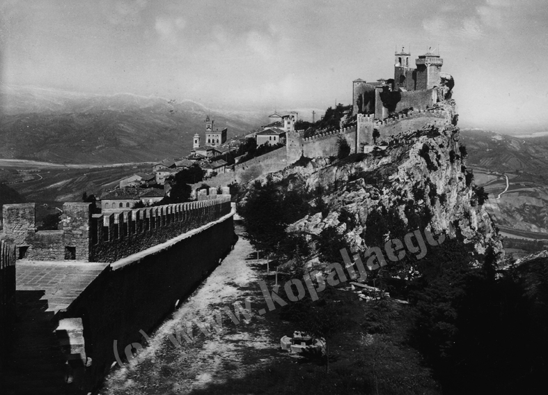 Die Hauptstadt SAN MARINO auf dem Kalksteinrücken des Monte Titano, welcher das ganze Land durchzieht. SAN MARINO wird als die älteste Republik Europas bezeichnet. Seit dem Jahr 301 soll sie als Republik umgeben von italienischen Gebieten existieren. Obwohl sie offiziell als neutral in den Unruhen des Risorgimento galt, unterstützte sie doch die republikanischen Bestrebungen im Rahmen der italienischen Vereinigung. Aufnahme ungefähr aus den 50er Jahren des 19. Jahrhunderts. Sammlung ECKEL - Beim Klick auf das Bild öffnet sich ein neues Fenster mit einer grösseren Darstellung des Bildes!