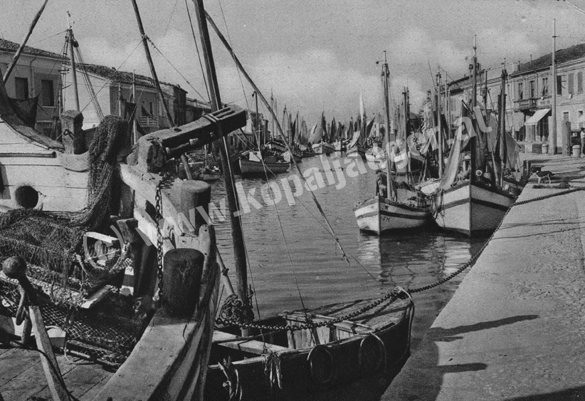 Der Hafen von CESENATICO. Am Beginn des 16. Jahrhunderts wurde der Hafen auf der Grundlage eines antiken Hafens von LEONARDO DA VINCI im Auftrag der Familie BORGIA als Hafen der Stadt CESENA neu gestaltet. Bis in die 70er Jahre des 20. Jahrhunderts waren die traditionellen Brazzeri der Adriaküste als Fischerboote im Einsatz, noch heute liegen einige davon als Museumsstücke im alten Hafen von CESENATICO. Aufnahme ungefähr aus den 60er Jahren des 19. Jahrhunderts. Sammlung ECKEL - Beim Klick auf das Bild öffnet sich ein neues Fenster mit einer grösseren Darstellung des Bildes!