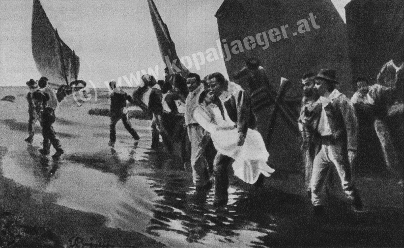 Die Landung GARIBALDIs mit der kranken und schwangeren Anita in seinen Armen in MAGNAVACCA am 3. August 1849. Sammlung ECKEL - Beim Klick auf das Bild öffnet sich ein neues Fenster mit einer grösseren Darstellung des Bildes!