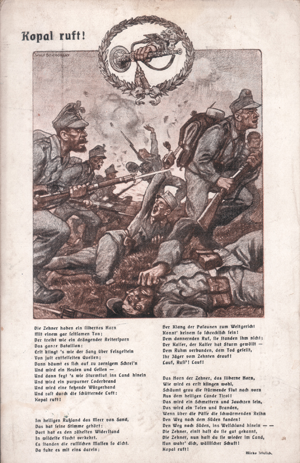 Diese Feldpostkarte, deren Reinertrag der Kopal-Invalidenstiftung gewidmet war bezieht sich auf eine Ausgabe einer humoristischen Zeitschrift ("Die Muskete" Nr 572[1]) und enthält ein, dem Zeitgeist entsprechendes schwülstig-patriotisches Gedicht.