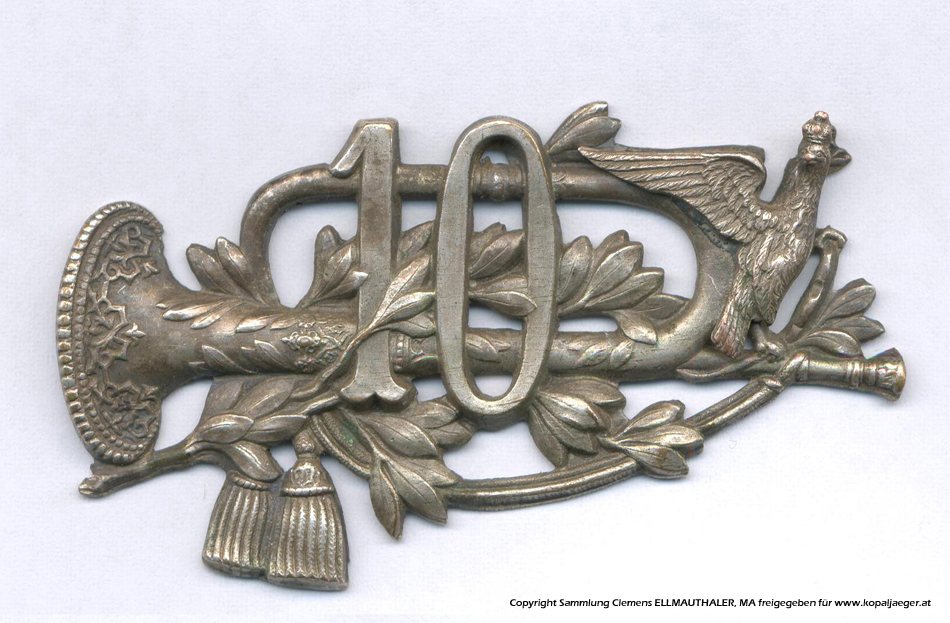Beim Jägerbataillon Kopal Nr. 10 gab es eine Vielzahl von Symbolen und Erkennungsmerkmalen, welche in der gesamten Armee eindeutig den Kopaljägern zugeschrieben wurden und welche natürlich auch auf den Kappenabzeichen ihren Niederschlag fanden. Dazu zählte die Bataillonszahl "10" - meist als römische Zahl verwendet, wenn kein anderes zusätzliches Attribut verwendet wurde - welche zwar als Ziffer auch bei anderen Einheiten (Landwehr Regiment, Infanterieregiment etc.) vorhanden war, jedoch primär dem Jägerbataillon Nr. 10 zugeordnet wurde. Ebenso natürlich der Schlachtruf "Monte Berico - Kopal ruft" als Ganzes oder in Teilen und der Namensgeber "Kopal", lange bevor der Name dem Bataillon als immerwährender Zusatz verliehen wurde und natürlich auch das Ehrensignalhorn aus 1849.