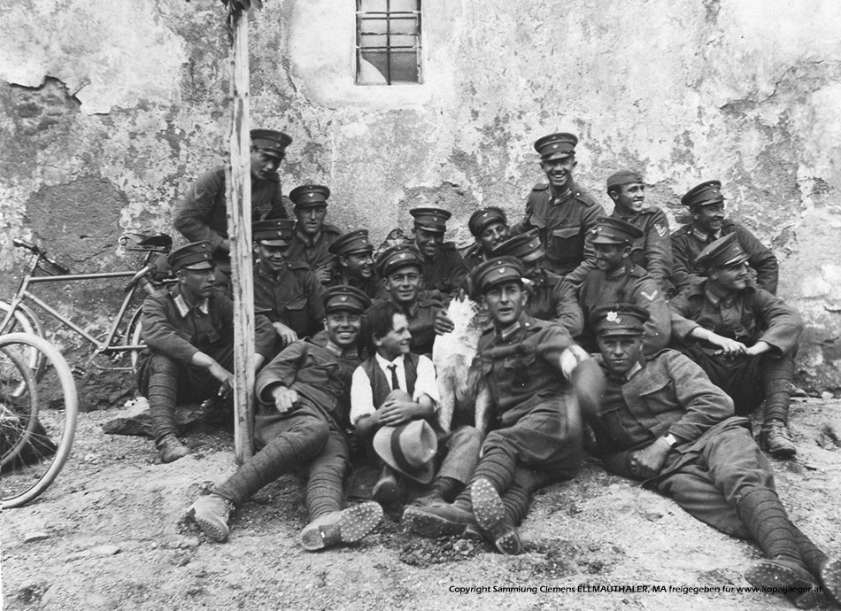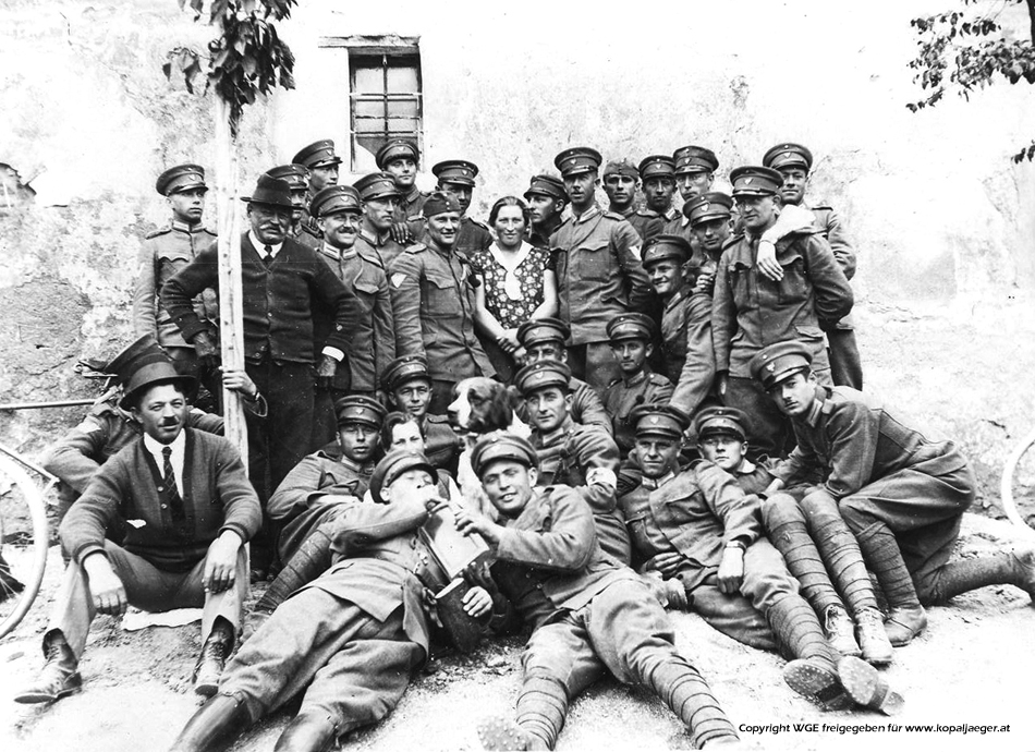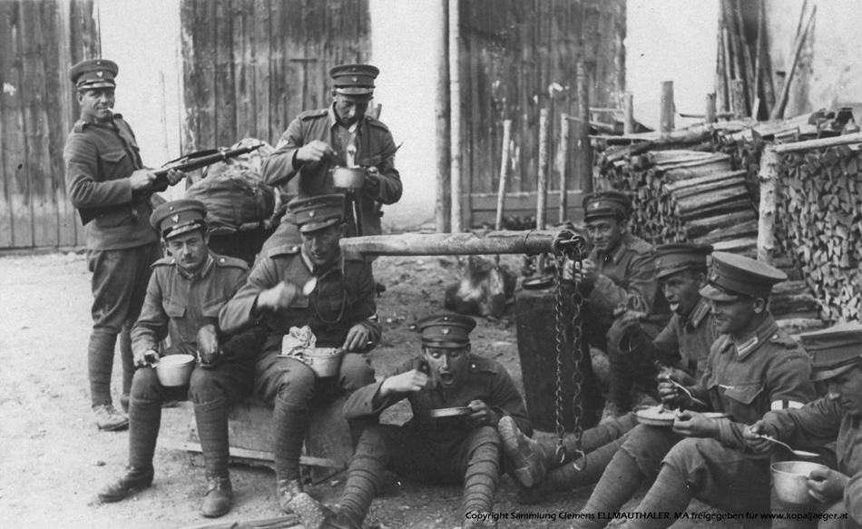 Gruppe bei der Mittagsrast. Der Gesichtsausdruck einiger Jäger lässt darauf schliessen, dass die Verpflegung noch nicht ganz dem Geschmack der Feldjäger entspricht. Bemerkenswert die Essgeschirre nach altösterreichischem Muster.