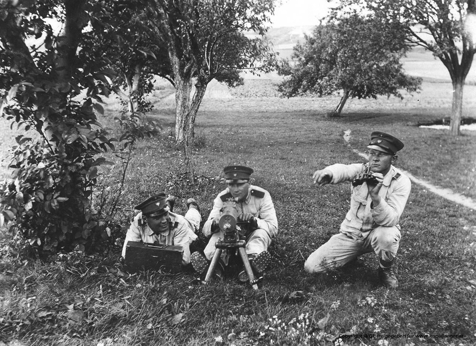 Eines der wenigen Fotos aus dem "Kampfgeschehen" der Manöver in Lang-Mannersdorf 1931: MG Trupp mit MG Schwarzlose in Stellung bei Zielansprache.