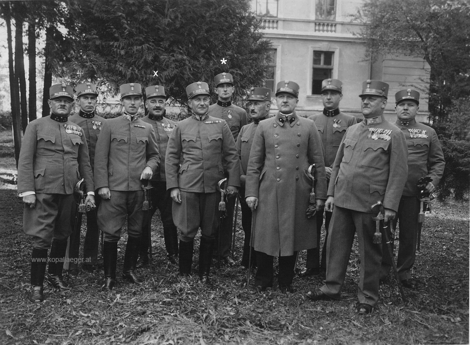 Das Offizierskorps des 3. Bataillons der Oberösterreichischen Jäger in STEYR am 17. Oktober 1936. 4. von links Hauptmann FASCHING (mit „x“ gekennzeichnet), 6. von links Oberleutnant WALLERGRABER [22]. Foto THEM STEYR 1936, Archiv der Österreichischen Militärhistorie, Dr. Strigl, Wien - Beim Klick auf das Bild öffnet sich ein neues Fenster mit einer grösseren Darstellung des Bildes!
