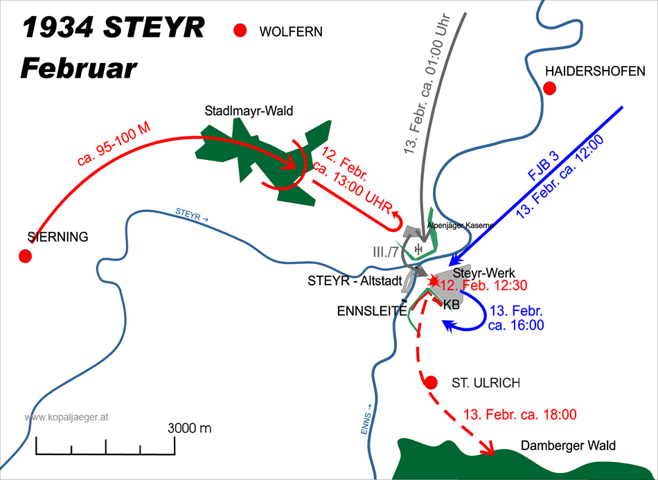 Am Montag Vormittag erreichten die Gerüchte über die Vorfälle in LINZ auch die Industriestadt STEYR. Am Vormittag hatten in der Steyr-Werke A.G. noch Verhandlungen zwischen der Geschäftsleitung, Direktor Wilhelm HERBST, und der Arbeiterschaft über Lohnfragen stattgefunden, welche zu teils hitzigen Wortgefechten geführt haben sollen[13], während ab 11:00 Uhr im Steyr-Werk bereits unter der Leitung des Betriebsratsobmannes August MOSER die Vorbereitungen zum Generalstreik der Arbeiterschaft anliefen und um 11:15 die Telefonzentrale des Werkes unter dem Schutzbundführer Betriebsrat Alois ZEHETNER zerstört wurde[14]. Um ca. 11:50[15] wurde der Direktor des Werkes beim Besteigen seines Wagens bei der Portierloge der Steyr-Werke[16] durch mehrere Schüsse in den Kopf getroffen und verstarb sofort in seinem bereits mit laufendem Motor stehenden Wagen. Ab diesem Zeitpunkt wurde der Bereich um den Wagen des ermordeten Direktors von der Stellung der Sozialisten in den Gemeindehäusern auf der ENNSLEITE mit Maschinengewehren unter Feuer genommen, sodass der Tatort erst am 14. Februar nach der Befriedung von STEYR untersucht werden konnte[17]. Die Befragung von Zeugen ergab danach, dass sich sieben maskierte Männer hinter der Portierloge der Steyr-Werke versteckt hatten und zwei davon mit Karabinern den Direktor von hinten im Auto erschossen hatten[18]. Noch während in den Steyr-Werken der Generalstreik anlief, wurden in der Karl-Marx-Straße auf der ENNSLEITE die beiden Polizeibeamten Karl KURFNER und Franz SPARLINEK um 11:15 von Schutzbündlern beschossen, wobei Letzterer verwundet wurde[19]. Als nach diesem Mord und dem Beschuss des Tatortes die 3. Kompanie des Alpenjägerregiments Nr. 7 aus der Alpenjägerkaserne am TABOR in STEYR unter Hauptmann FASCHING um 12:45 über die Damberggasse[20] gegen die Stellung in den Gemeindehäusern auf der ENNSLEITE vorrückte, wurde auch diese sofort unter Beschuss genommen. Der Kompaniekommandant wurde bereits beim ersten Ansatz durch Hand- und Beinschuß ebenso wie mehrere andere Angehörige der Kompanie verwundet[21] und musste das Kommando an Oberleutnant Karl WALLERGRABER abgeben.