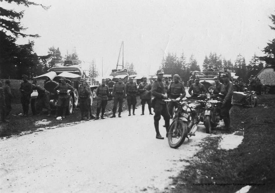 Da der Seebergsattel westlich von Bad Vellach auf der B210 auch heute noch die Grenze zu Slowenien darstellt, dürfte das Foto dieser Rast in der Nähe der Grenze erst nach dem Grenzübertritt der Lavanttaler Putschisten bei RABENSTEIN am 30. Juli angefertigt worden sein. Dass der Eil-Motmarsch durch halb Österreich, die Verfolgung Flüchtenden durch halb Kärnten und natürlich auch die Bergfahrt über die Serpentinen zum Seebergsattel auch das Material belastete, zeigen die geöffneten Motorhauben der geländegängigen Austro-Daimler Mannschaftstransportwagen (ADG).