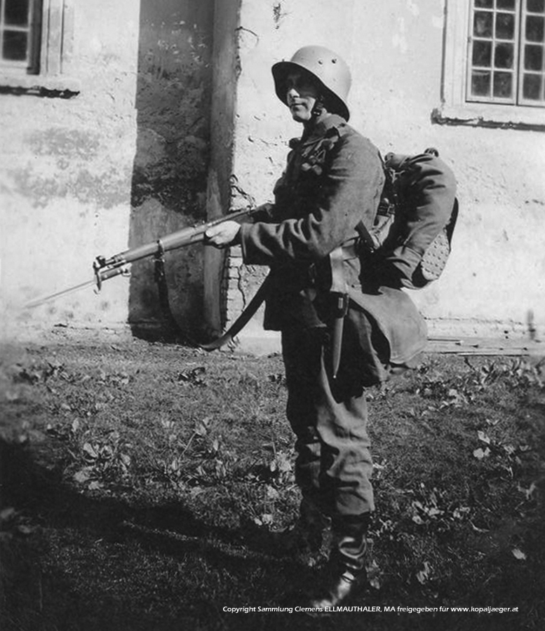 Feldjäger in Kampfadjustierung um 1934/35, die ärarischen genagelten Schuhe sind allerdings im Tornister untergebracht, statt dessen trägt der Feldjäger Knobelbecher nach deutschem Muster- Beim Klick auf das Bild öffnet sich ein neues Fenster mit einer grösseren Darstellung des Bildes!