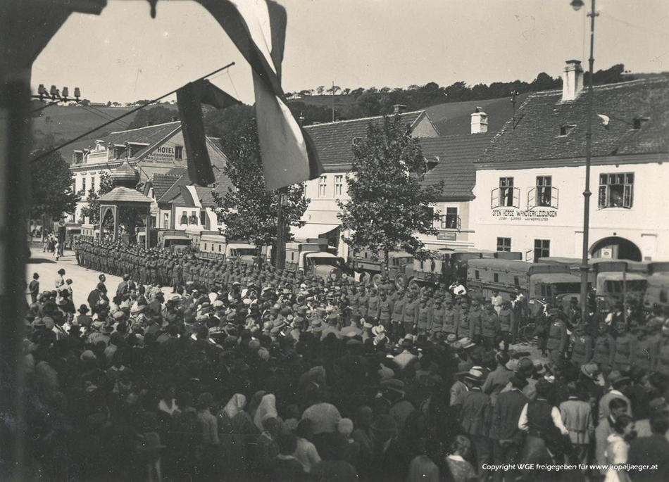 Manöver in Kirchschlag in der buckligen Welt 1935Anders als heute wurden Manöver in früherer Zeit grundsätzlich mit einer Parade beziehungsweise einer Defilierung vor zahlreichem Publikum abgeschlossen. Die Bevölkerung in Kirchschlag nahm die Soldaten mit besonderer Freude auf, da sich im Jahr 1921 schwere Kämpfe um Kirchschlag zwischen ungarischen Freischärlern und Österreichischen Einheiten erreignet hatten.