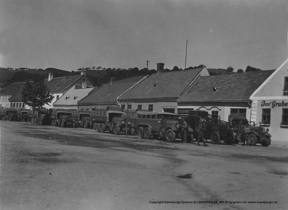 Aufstellung der Fahrzeuge des Kraftfahrjägerbataillons in Kirchberg in der Buckligen Welt (KIRCHBERG AM WECHSEL) - Beim Klick auf das Bild öffnet sich ein neues Fenster mit einer grösseren Darstellung des Bildes!