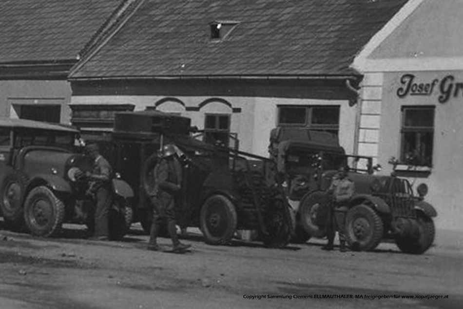 Detail der Fahrzeugaufstellung für den Manöverabschluss in KIRCHBERG in der Buckligen Welt 1935 mit dem Lancia-Ansaldo Panzerwagen- Beim Klick auf das Bild öffnet sich ein neues Fenster mit einer grösseren Darstellung des Bildes!