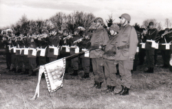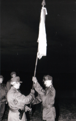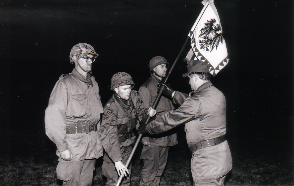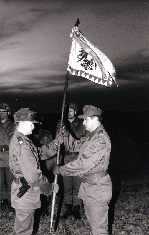 Oberst EGGER übergibt die Standarte wieder dem Feldzeichentrupp. Damit war die militärisch- zeremonielle Übergabe des Bataillons an das Jägerregiment 3 vollzogen - Beim Klick auf das Bild öffnet sich ein neues Fenster mit einer grösseren Darstellung des Bildes!