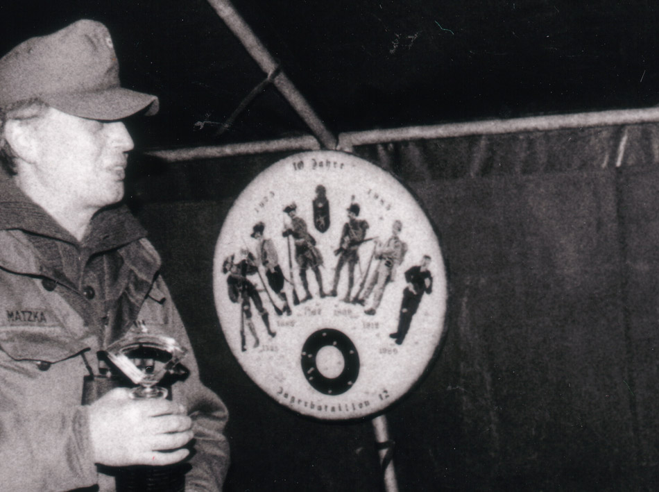 Als Dekoration des Festzeltes sind im Hintergrund Schützenscheiben zu erkennen. Dies war eine Jahrzehnte gepflogene Tradition des Offizierskorps des Jägerbataillon 12 zu speziellen Anlässen, welche erst 1999 nach der "Abschiedsscheibe" für Oberstleutnant Mag. MATZKA zum Erliegen kam. Traditionell wurden die Scheiben stehend frei mit Pistole beschossen, Fehlschüsse kosteten den Schützen eine Flasche Sekt, welche nach Abschluss der Übung meist im Standortkasino gemeinsam geleert wurden. 1994 war die Scheibe jedoch noch nicht fertiggestellt, sodaß auf eine Skizze geschossen werden musste.