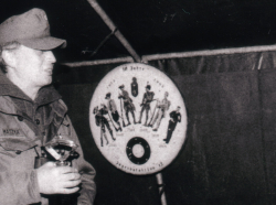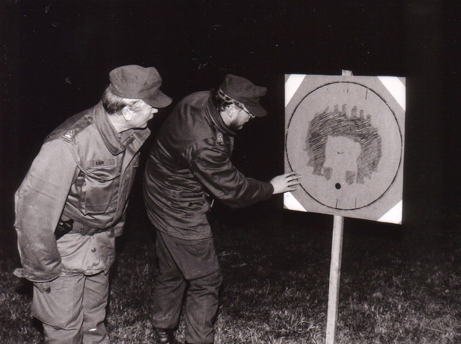 Links im Hintergrund ist die Scheibe anlässlich des 10jährigen Jubiläums des Jägerbataillon 12 zu erkennen, rechts die unfertige Scheibe 1994, wobei Oberst KAHN gerade sein Trefferergebnis aufgezeigt bekommt - Beim Klick auf das Bild öffnet sich ein neues Fenster mit einer grösseren Darstellung des Bildes!