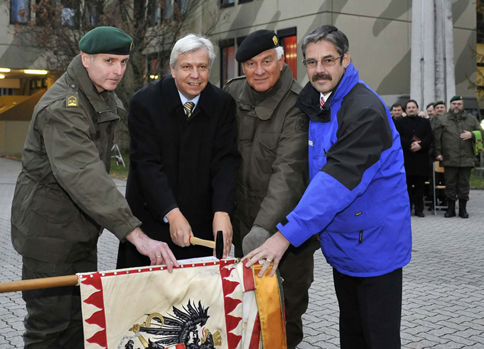 Benagelung der Standarte am 9.November 2008, Obstlt KRANISTER, Abg.z.NÖ LT HEURAS, GM Prof. CULIK, GD der Raiffeisenholding NÖ-W HAMESEDER (v.l.); Foto: JgBNÖ - Beim Klick auf das Bild öffnet sich ein neues Fenster mit einer grösseren Darstellung des Bildes!