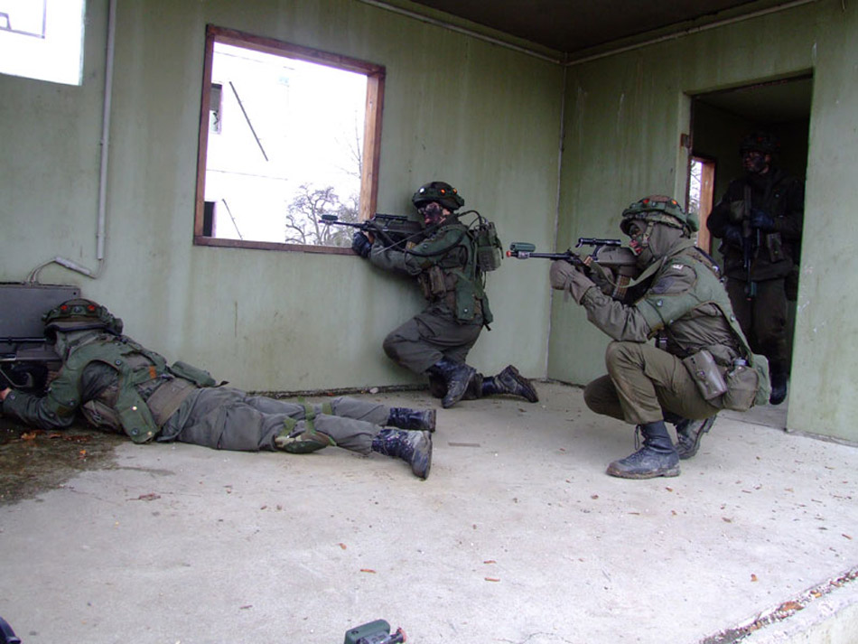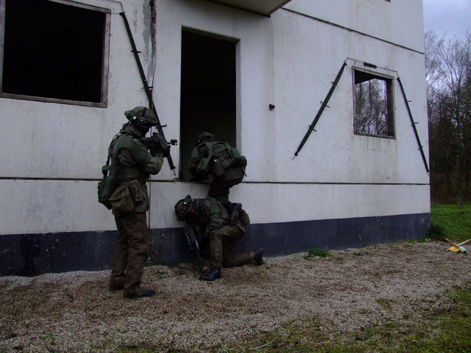 Vorbereitung für das Eindringen eines Trupps in ein Haus in der Häuserkampfanlage EBELSBERG mit angelegten "DuSim" (Duellsimulator) Sensoren zur Echtzeitauswertung; Foto JgB NÖ, - Beim Klick auf das Bild öffnet sich ein neues Fenster mit einer grösseren Darstellung des Bildes!