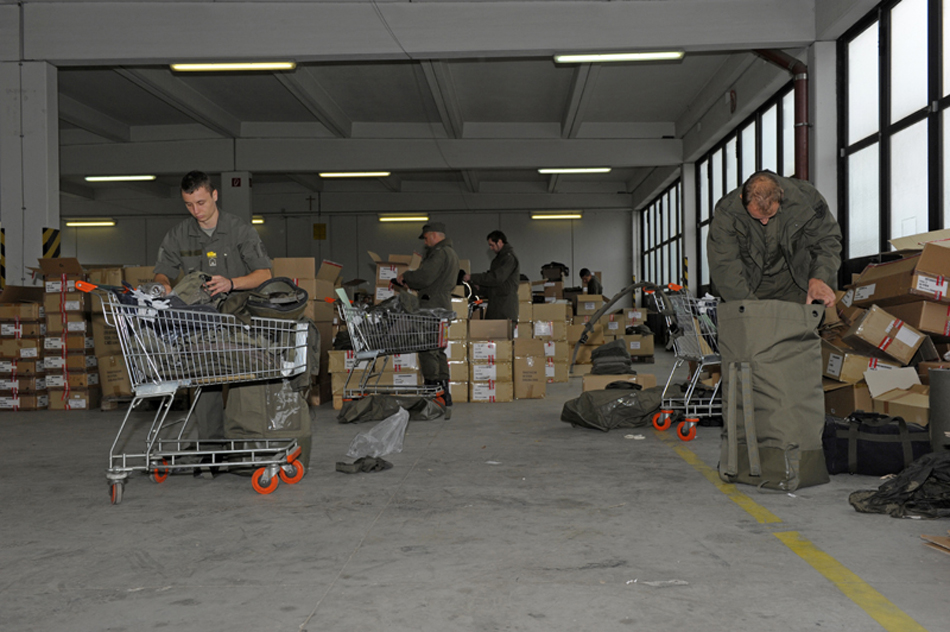 Der "Bekleidungs- und Ausrüstungssupermarkt" in der Kaserne AMSTETTEN. Durch die Erfahrungen mit der Ausrüstung von Einheiten für internationale Einsätze der Versorgungsstelle AMSTETTEN und einer straffen Ablaufplanung durch die Wirtschaftsoffizierin des Jägerbataillons erfolgte die Umrüstung des Bataillons inklusive der Abgabe der Altausrüstung am ersten Halbtag der Übung - Beim Klick auf das Bild öffnet sich ein neues Fenster mit einer grösseren Darstellung des Bildes!