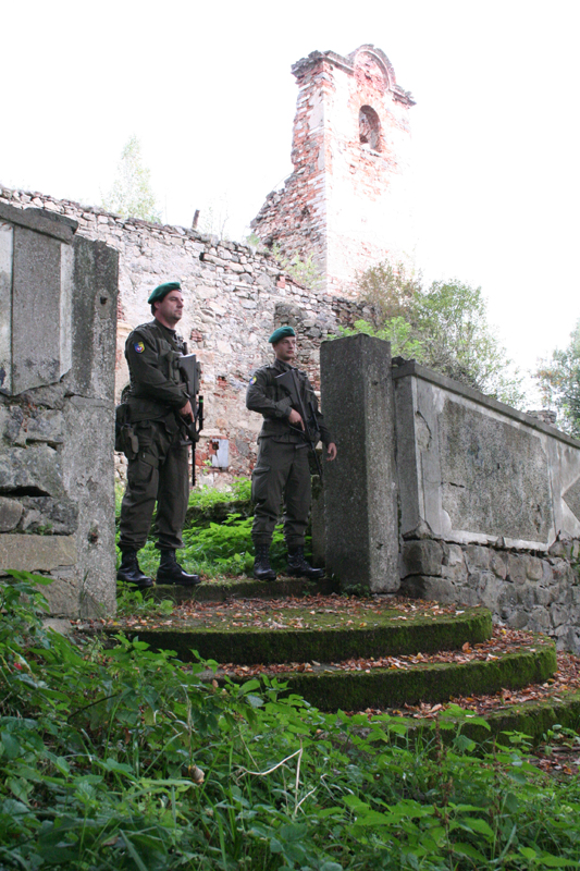 Von links: Die verfallene Wallfahrtskirche in Oberndorf, die Besichtigung der Kirche durch Teile des Bataillonsstabes mit dem Erkennungstransparent der Übung, darunter die Ehrenwache des Bataillons für die Kirche - Beim Klick auf das Bild öffnet sich ein neues Fenster mit einer grösseren Darstellung des Bildes!