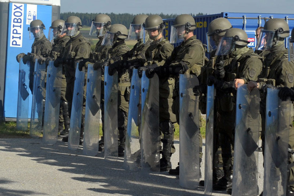 Der CRC (Crowd and Riot Control) Zug der 2. Kompanie (Kdt. Olt. PANOVSKY) im Lager FLA-Haus GERMANNS. Im Hintergrund der "running gag" der EURAD, die MobilWC´s welche bei Stellungswechseln von zivilen Firmen den Truppen "nachgebracht" werden mussten und durch ihre dezente Farbgebung die Tarnung im Gelände signifikant erschwerten - Beim Klick auf das Bild öffnet sich ein neues Fenster mit einer grösseren Darstellung des Bildes!