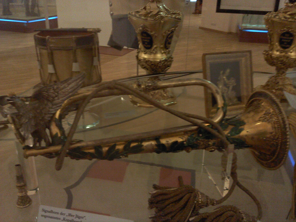 Das Ehrenhorn im Dezember 2011 in seiner derzeitigen Ausstellungsvitrine im HGM neben diversen anderen Erinnerungsstücken oxidierend abgelegt, das Mundstück daneben liegend. - Beim Klick auf das Bilder öffnet sich ein neues Fenster mit einer grösseren Darstellung des Bildes!