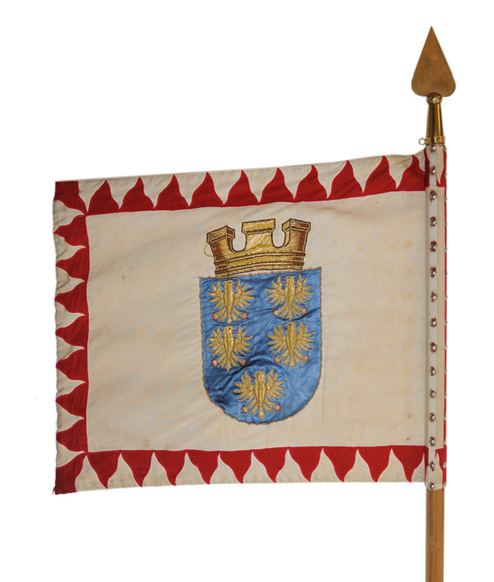 Beidseitig: Standartenblatt umrahmt in rot/weiß/roten Flammen - Beim Klick auf das Bilder öffnet sich ein neues Fenster mit einer grösseren Darstellung des Bildes!
