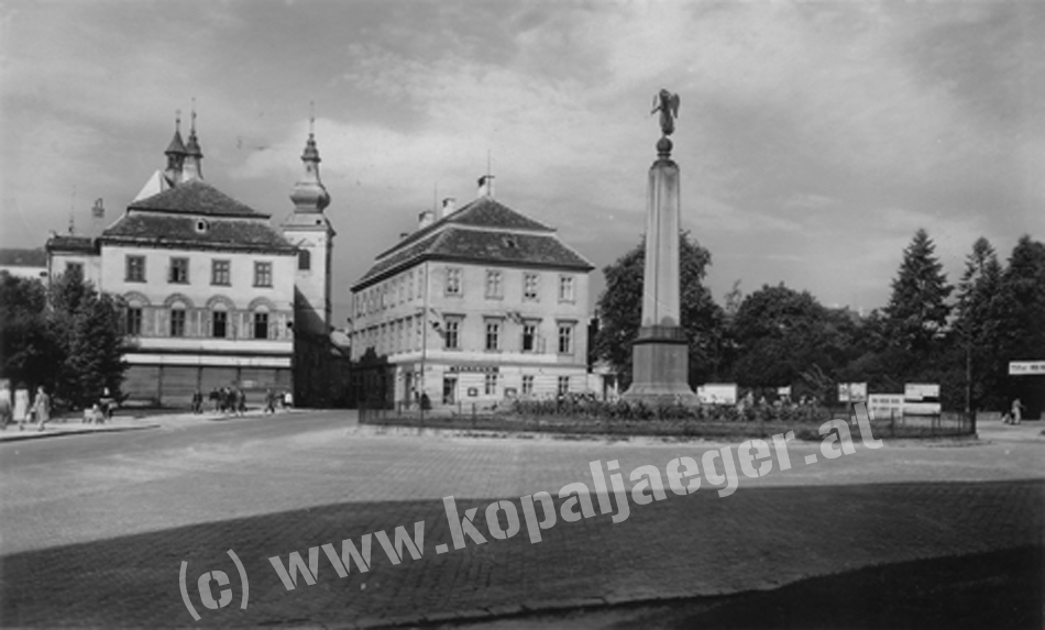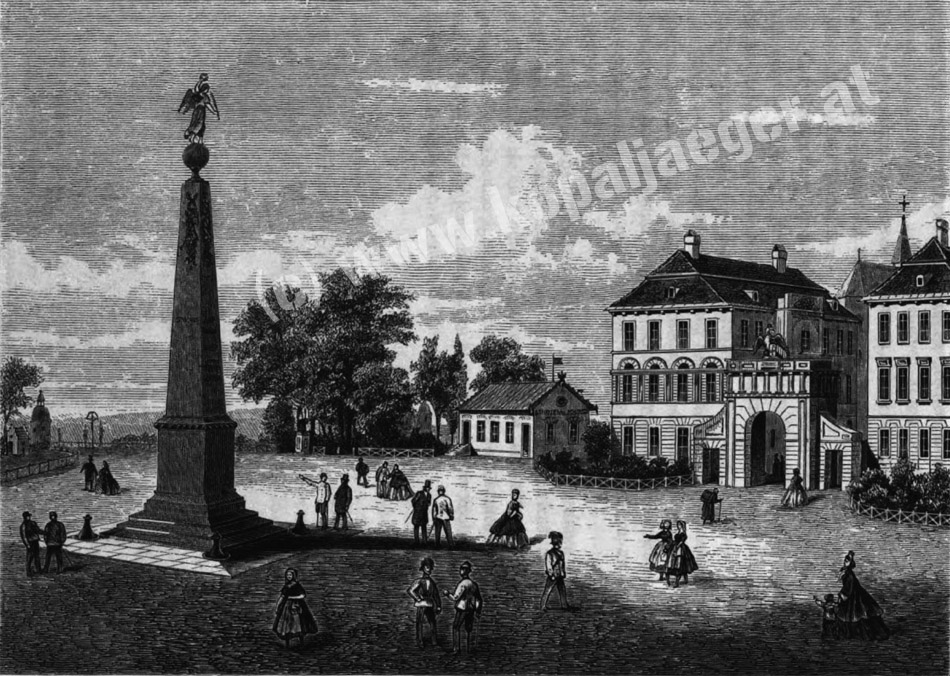 Darstellung der Situation in Znaim mit Denkmal und Wächterhäuschen rechts hinter dem Denkmal in: STRACK J., Das Kopal-Denkmal in Znaim und das k.k. 10. Feld-Jäger-Bataillon von der Errichtung bis zur fünfzigjährigen Jubelfeier, WIEN 1864 - Beim Klick auf das Bild öffnet sich ein neues Fenster mit einer grösseren Darstellung des Bildes!