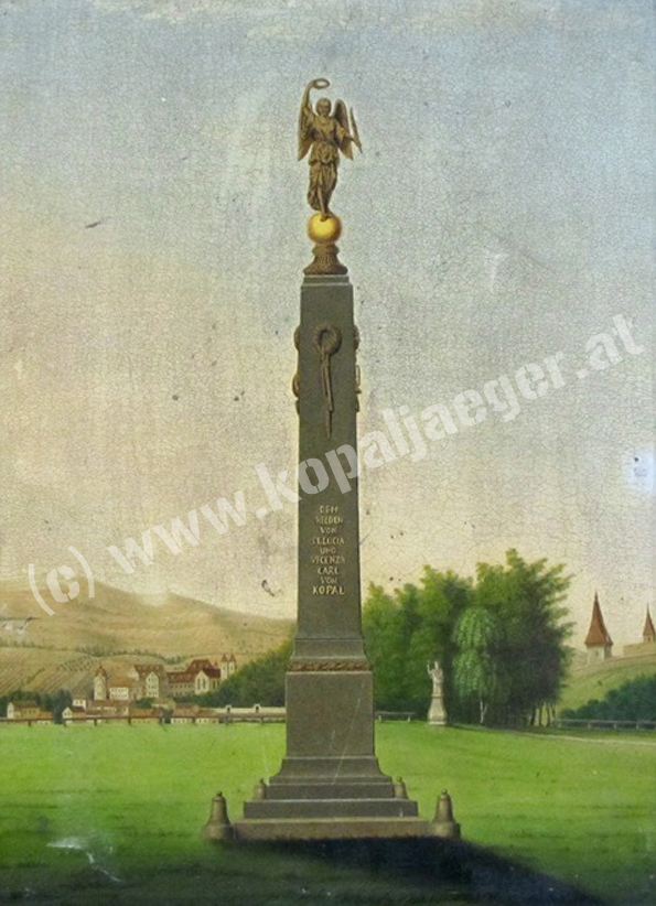 Das Kopal Denkmal in einer künstlerischen Darstellung, wie es sich knapp nach 1853 gezeigt haben könnte, bevor die Stadt ZNAIM um den Kopalplatz herum erweitert wurde. Im Hintergrund ist das fürstlich Dietrichstein'sche Schlosse zu Nikolsburg dargestellt. Bild HGM Wien - Beim Klick auf das Bild öffnet sich ein neues Fenster mit einer grösseren Darstellung des Bildes!