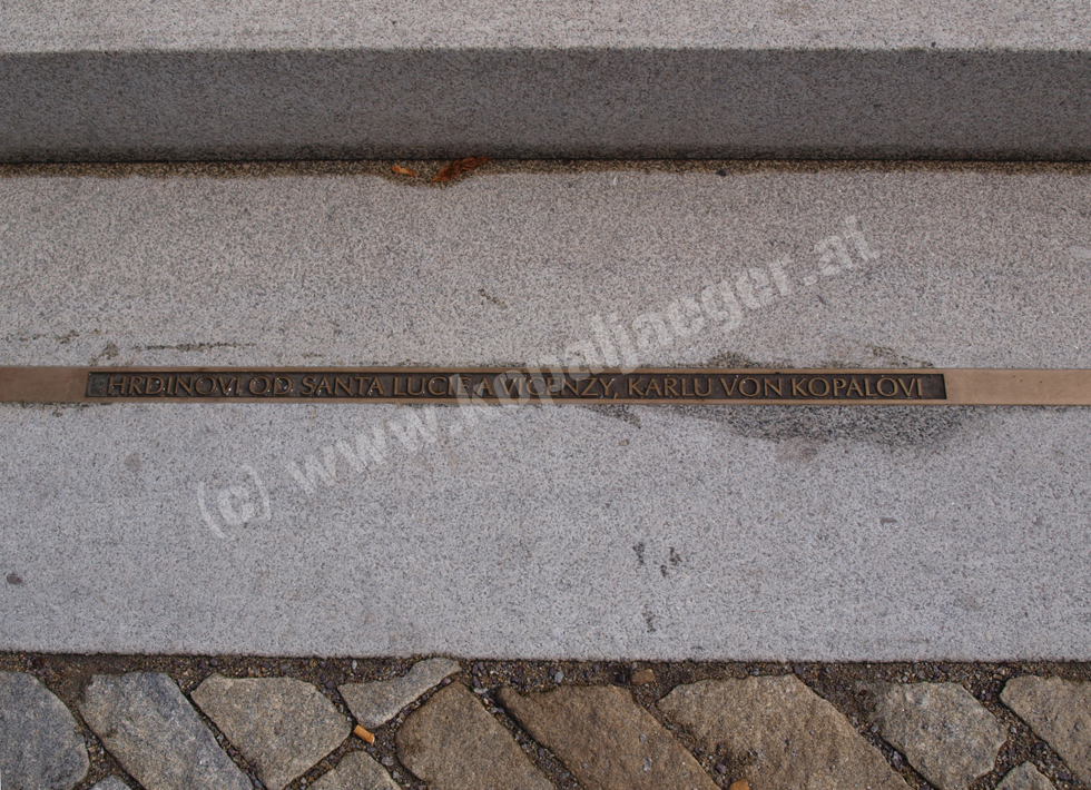 HRDINOVI OD SANTA LUCIE A VICENZY, KARLU VON KOPALOVI Südseite: „K. K. Oberst des 10. Feld-Jäger-Bataillons, Ritter des Militär-Maria-Theresien- und des österreichischen Leopold-Ordens, Patricier zu Fiume und Buccari“