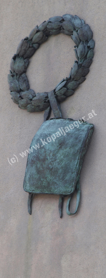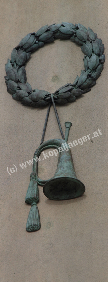 Das Kopal Denkmal nach der Restaurierung 2010 - Die wieder angebrachten Rüstungs- und Ausrüstungsgegenstände der Jägertruppe, links die Ostansicht mit Jägerhut aus 1848 mit Hahnenschweif, rechts die Nordansicht mit einem Jägertornister- Beim Klick auf das Bild öffnet sich ein neues Fenster mit einer grösseren Darstellung des Bildes!