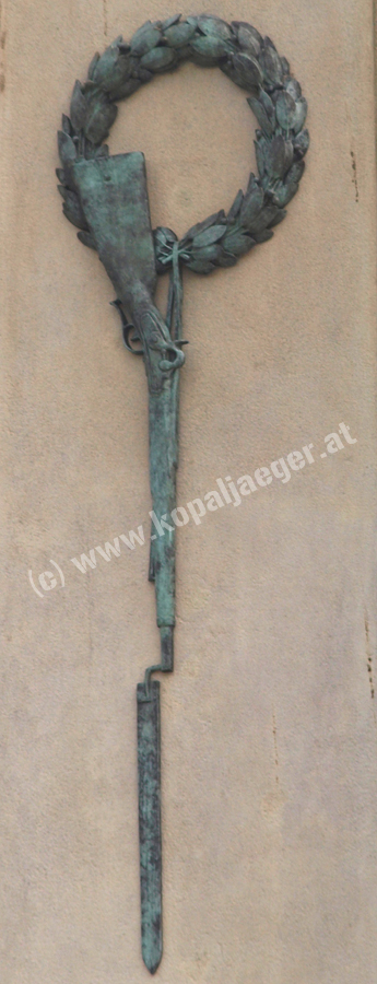 Das Kopal Denkmal nach der Restaurierung 2010 - Die wieder angebrachten Rüstungs- und Ausrüstungsgegenstände der Jägertruppe, links die Westansicht mit Jägerbüchse und Bajonett, rechts die Südansicht mit einem Signalhorn- Beim Klick auf das Bild öffnet sich ein neues Fenster mit einer grösseren Darstellung des Bildes!