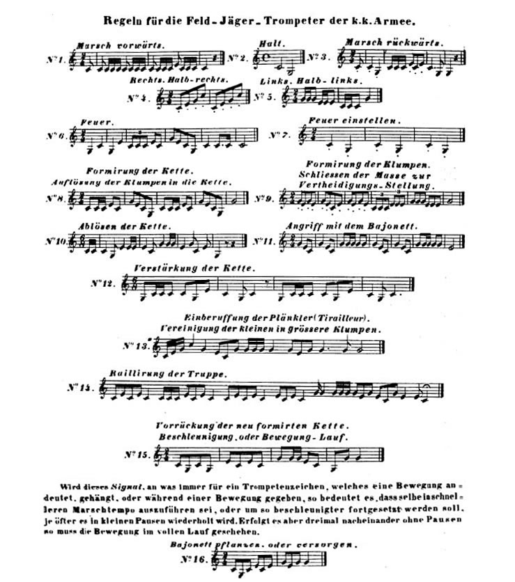Signale für die Feld-Jäger-Trompeter der k.k. ArmeeDurch die aufgelöste Kampfführung der Jägertruppe am Gefechtsfeld wurden die Befehle des Bataillonskommandanten bzw. der Kompaniekommandanten den Truppen mittels Hornsignalen übermittelt. Die früheren traditionellen Jagdhörner wurden bereits vor der Mitte des 19. Jahrhunderts durch Signaltrompeten und Signalhörner abgelöst. Die Jagdhörner der Jägertruppe blieben nur mehr als Abzeichen erhalten.